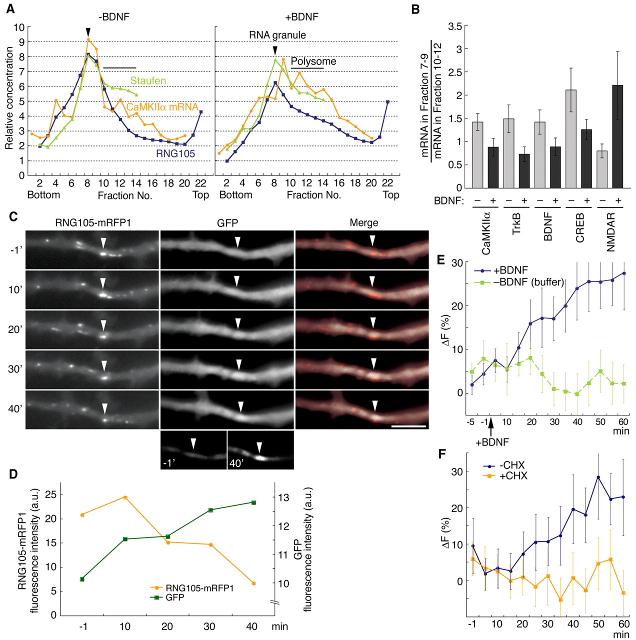 Figure 7. BDNF induces mRNA shift from the RNA granules to polysomes and local translation near the granules. A, Extracts from control or BDNF-stimulated rat hippocampal slices were fractionated by sucrose density gradient centrifugation and then RNG105, staufen, and CaMKIIα mRNA we reanalyzed semiquantitatively (means from 3 independent experiments). B, The indicated mRNAs were analyzed as in A. The ratios of the mRNA in the RNA granule fractions to that in the lighter fractions (polysomes) are shown. C, Rat cultured hippocampal neurons were transfected with both GFP reporter fused to the CaMKIIα 3â²UTR and RNG105-mRFP1. Time-lapse images of GFP and RNG105-mRFP1 proteins after BDNF stimulation are shown. Arrowheads denote the position of a granule with a stationary localization during the imaging period. RNG105-mRFP1 in the granule was reduced after BDNF stimulation, which coincided with the increase in GFP signal near the granule. To image clearly the increase in GFP signal near the granules, enhanced images of the GFP signal -1 and 40 min after the stimulation are shown at the bottom. Other granules were motile and changed their positions during the experiment. Scale bar, 5 μm. D, Profiles of RNG105-mRFP1 and GFP fluorescence intensity in the granule indicated by arrowheads in C. a.u., Arbitrary units. E, Profile of GFP fluorescence changes during the experiment in C. The changes in GFP fluorescence intensities near the RNG105-localizing RNA granules between the indicated time points and t = -10 min are plotted. Data are means ± SE from eight granules of two independent experiments. F, The same experiment as in E, except for the addition of 10 μg/ml cycloheximide (CHX) 10 min before the BDNF stimulation. Error bars represent SEM. |