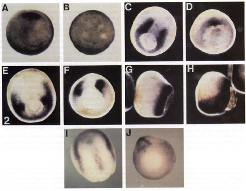 F, and G are from the same experiment. (I) Vegetal view of Xbra expression in an uninjected, stage 11 embryo. Dorsal is up. (J) Veg(~tal view of