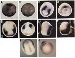 of Xwnt-8 expression in a stage 11.5 embryo i njeeted with 6BMPR RNA. Xumt-8 expression is nearly eliminated. Dorsal is up. Embryos in D, E,