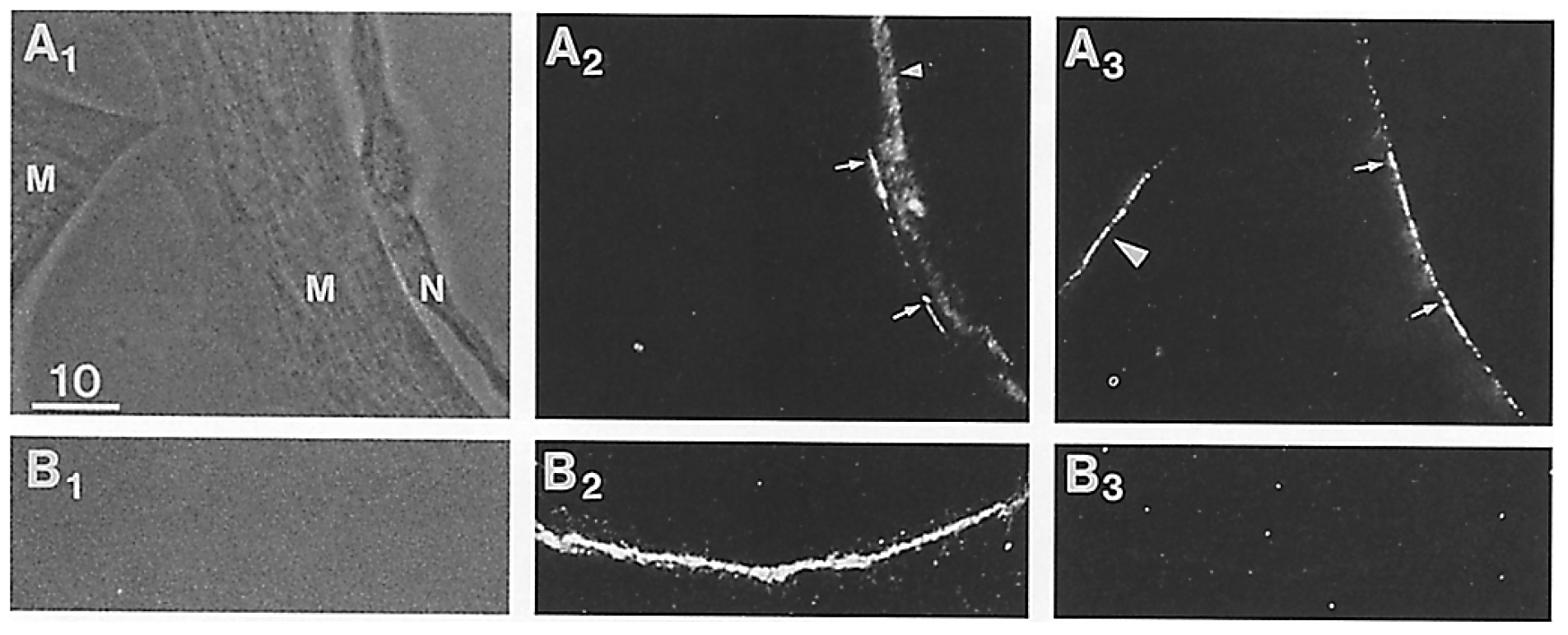 before immunofluorescent staining, as shown in BI (phase-contrast), B2 (agrin), and B3 (aDG). Bar, 10 #m.