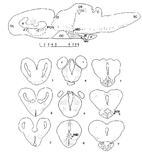 Melanin-concentrating hormone (MCH) is a vertebrate neuropeptide produced in hypothalamic neurons. In bony fish, such as trout, MCH acts as a neurohypophysial hormone which, once released into the circulation, acts on pigmented skin cells with the result that the fish turns pale to camouflage itself against a light colored background. In other animals the role of MCH is not clearly established but it appears to be a neuromodulator/transmitter within the central nervous system rather than a hormone. The present study examines MCH function in the grass frog, Rana temporaria. Using immunocytochemistry the location and morphology of irMCH neurons were followed, from tadpole to adult frog. In adult R. temporaria a group of MCH neurons appeared to comprise small and large-celled populations located in the ventral and dorsal infundibular regions, respectively. A group of MCH neurons in the preoptic area is proposed, although the perikarya were rarely immunostainable. Immunoreactive fibers were seen in various areas of the brain, including the olfactory lobes, optic tecta, habenular nucleus, and spinal cord. Immunoreactive MCH cells were only visible in midmetamorphic climax stages, and cellular morphology suggested low secretory activity until the animal first emerged onto land at which time nuclear size and granulation increased significantly. No such increase was observed in equivalent stages of the South African clawed toad, Xenopus laevis, an animal which is fully aquatic throughout its life in contrast to R. temporaria which is terrestrial.(ABSTRACT TRUNCATED AT 250 WORDS)