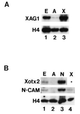 Fig. 6. Xotx2 induces cement gland marker expression in isolated animal caps. (A) RT-PCR analysis of RNA derived from stage 21 embryos (lane 1) and animal caps isolated from uninjected (lane 2) and Xotx2-injected embryos (lane 3) at stage 8 blastula, and developed until sibling embryos reached stage 21. RNA was subjected to RT-PCR analysis using oligonucleotides specific for the cement gland marker XAG1 and histone H4. (B) RT-PCR analysis of RNA derived from stage 21 embryos (lane 1) and animal caps isolated from uninjected (lane 2), noggin-injected (lane 3) and Xotx2- injected embryos (lane 4) at stage 8 blastula, and developed until sibling embryos reached stage 21. RNA was subjected to RT-PCR analysis using oligonucleotides specific for Xotx2, N-CAM, and histone H4. Lanes marked E, A, N, and X contain PCR products from normal embryos, animal (uninjected control) caps, noggin- injected caps, and Xotx2-injected caps, respectively.