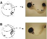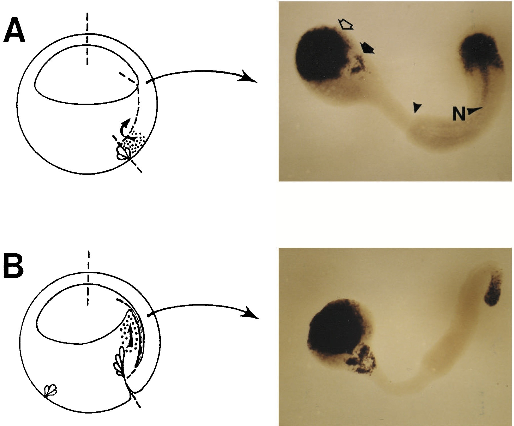 Fig. 8. Planar signals are sufficient to induce Xotx2 expression in ectoderm. Keller sandwiches were prepared from stage 10â, 10.0, 10+, 10.25 and 10.5 embryos. Sandwich explants were developed to stages 17-19, fixed, and subjected to whole-mount in situ hybridization using Xotx2 and Krox20 probes. (A) Schematic diagram illustrating the arrangement of the anteriormesoderm (stippled) of a stage 10- embryo before involution and a representative Keller sandwich derived from stage 10- embryos. (B) Schematic diagram illustrating the arrangement of the anteriormesoderm (stippled) of a stage 10.5gastrula and a representative Keller sandwich derived from a stage 10.5embryo. The dotted lines indicate the positions of incisions made to prepare the Keller explants. In both right panels, ectoderm is progressively more anterior toward the left and the mesoderm is progressively more anterior toward the right. Notochord is designated N. The boundary of mesoderm and ectoderm is indicated by the arrowhead. Xotx2 staining (open arrow) of the ectoderm is anterior to the characteristic striped pattern of Krox20 (filled arrow). In the stage 10â sandwich (A), there is clear Xotx2 staining in the anterior notochord.