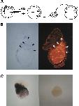 Fig. 7. Ectodermal expression of Xotx2 can be induced by vertical signals. (A) Schematic representation of construction of mesoderm-ectoderm conjugates. Albino embryos were injected with lysinated-rhodamine dextran (LRD) into the marginal zone of all blastomeres of 2-4 cell stage embryos. At early gastrula stage (10.25), involuted mesoderm was dissected out and wrapped in stage 10.25 gastrula ectoderm from uninjected albino embryos. Conjugates were developed until siblings reached stage 15, fixed, and subjected to whole-mount in situ hybridization using Xotx2 probe. (B) Light (left) and fluorescence (right) micrographs of sections through the whole-mount in situ hybridized stage 15 equivalent conjugate shown in C (left). Arrows mark the boundary between the labelled mesoderm and unlabelled animal caps. Note the ectodermal expression of Xotx2 surrounding the mesoderm. Incubation of ectoderm cap alone did not induce ectopic Xotx2 expression (C, right).