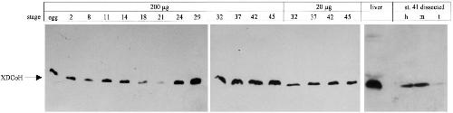 extracts (50 mg each) of stage 41 larvae dissected into head (h), middle (m), and tail (t).