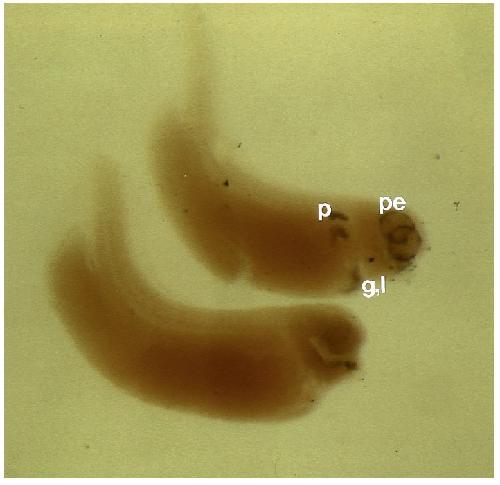 stained organs are the pronephros (p), eye vesicle (e), gut and liver (g, l) and the pigmented