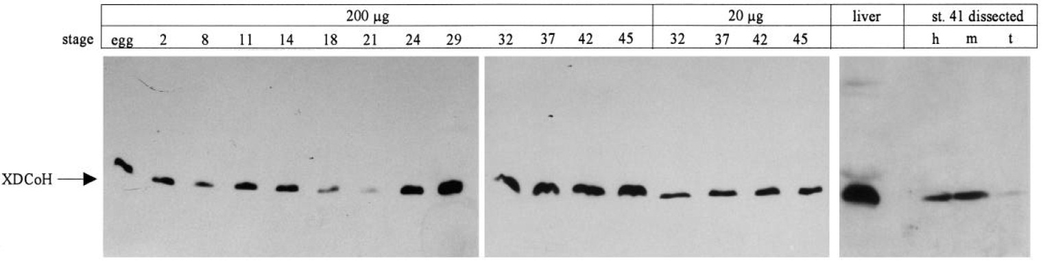 Fig. 6. Expression pattern of XDCoH during Xenopus development. Embryo extracts of different developmental stages (200 mg or 20 mg as