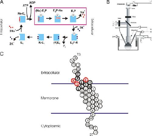 Figure 1. . (A) Albers-Post scheme for the Na+/K+ ATPase reaction cycle. (B) Scheme of the experimental setup used for voltage-clamp fluorometry. (C) Schematic diagram of the transmembrane domain and adjacent residues of the sheep β1 subunit of the Na+/K+-ATPase. The diagram depicts residues Arg-27 to Ala-73; in bold are shown the 11 residues Met-57 to Tyr-67, which were individually replaced by cysteines for the purpose of site-directed fluorescence labeling. Three residues that demonstrate significant fluorescence changes in response to voltage pulses are colored red. |