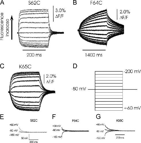 Figure 3. . Voltage pulse–induced fluorescence responses of the Na+/K+-ATPase with different single cysteine mutants of the β subunit under K+-free (Na+/Na+ exchange) conditions. Recordings originated from oocytes coexpressing the α subunit construct sNaKα1, ØCys together with sβ1-S62C (A), sβ1-F64C (B), sβ1-K65C (C). D shows the applied voltage protocol. Voltage jumps were performed from a holding potential of −80 mV to values between +60 mV and −200 mV in 20-mV steps. Since hyperpolarizing potentials result in an increase in fluorescence, negative potentials are shown at the top and positive potentials at the bottom of the voltage protocol. Note the expanded time scale for the recording in B. Voltage jump–induced transient currents, obtained as ouabain-sensitive difference currents (see materials and methods) recorded in parallel to fluorescence change signals for S62C (E), F64C (F), and K65C (G). |