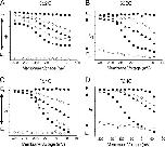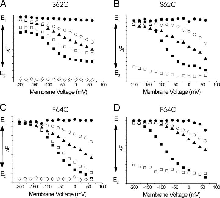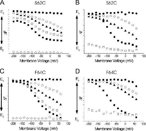Figure 6. . Voltage dependence values for fluorescence saturation amplitudes during K+ titrations, obtained from monoexponential fits to data traces from experiments as exemplified in Fig. 5. Top panels correspond to β subunit construct sβ1-S62C in (A) Na+-based and (B) NMDG-based solutions, bottom panels to β subunit construct sβ1-F64C, in (C) Na+-based and (D) NMDG-based solutions. Buffer compositions were as follows. (A and C) ▪, 100 mM Na+; □, 99.9 mM Na+ and 0.1 mM K+; ▴, 99.5 mM Na+ and 0.5 mM K+; ○, 99 mM Na+ and 1 mM K+; •, 95 mM Na+ and 5 mM K+; and ⋄, 100 mM Na+ and 10 mM ouabain. (B and D) ▪, 100 mM Na+; □, 100 mM NMDG; ▴, 99.9 mM NMDG and 0.1 mM K+; ○, 99.5 mM NMDG and 0.5 mM K+; and •, 99 mM NMDG and 1 mM K+. |