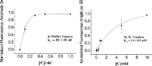 Figure 7. . Determination of the apparent K0.5 for the shift of the steady-state distribution between E1 and E2 states by external K+ at +60 mV. Data were derived from fluorescence changes for the Na+/K+-ATPase containing the β subunit construct sβ1-S62C in the presence of NMDG-based (A) or Na+-based (B) buffers. Solid lines represent fits of a Hill equation to the data (where nH = 1), with K0.5 values as stated. Each dataset was obtained from three oocytes (means ± SEM). |