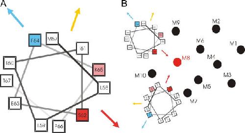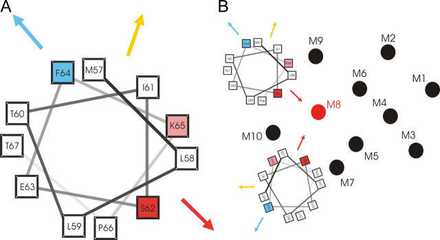 Figure 8. . Model of the analyzed region of the Na+/K+-ATPase β1 subunit and possible orientation of residues with respect to the α subunit. (A) The analyzed region of the sheep Na+/K+-ATPase β1 subunit adjacent to the extracellular plasma membrane interface is represented as a helical wheel assuming an α-helical structure. The last residue of the transmembrane domain, M57, aligns with a putative tri-glycine helix–helix interaction motif (see text), which points in the direction of the yellow arrow. The red arrow aligns with a cysteine residue (C45, not shown) within the transmembrane region of the β1 subunit that was shown to cross-link with helix M8 of the α subunit (Or et al., 1999; Ivanov et al., 2000). The blue arrow indicates the orientation of the F64 sidechain. (B) Putative orientation of the Na+/K+-ATPase β1 subunit's transmembrane helix with respect to the transmembrane domain of P2-ATPases. Views of the 10 transmembrane helices (M1 to M10) of the Na+/K+-ATPase α subunit perpendicular to the membrane plane from the cytoplasmic side are depicted as deduced from the SERCA crystal structure (Toyoshima et al., 2000). The Na+/K+-ATPase β1 subunit's transmembrane helix was oriented with C45 pointing towards M8 (in red) of the α subunit as suggested by cross-linking studies (Or et al., 1999; Ivanov et al., 2000), which allows positioning in two possible orientations according to Hasler et al. (2001). Arrows indicate the same directions as in A. |