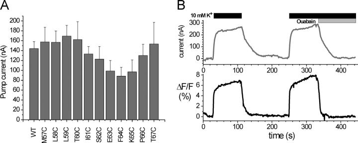 Figure 2. . Stationary current and fluorescence measurements of Na+/K+-ATPase α/β complexes containing different β subunit constructs upon expression in Xenopus oocytes. (A) Stationary pump currents of the Na+/K+-ATPase expressed with wild-type and single cysteine mutants of the β subunit at 0 mV holding potential in response to 10 mM K+. Data originated from 5–11 oocytes; values are means ± SEM. (B) Parallel recording of pump current (top) and fluorescence change (bottom) from an oocyte coinjected with Na+/K+-ATPase sNaKα1, ØCys and sβ1 -F64C cRNA in response to 10 mM K+ and 10 mM ouabain at 0 mV holding potential. |
