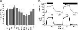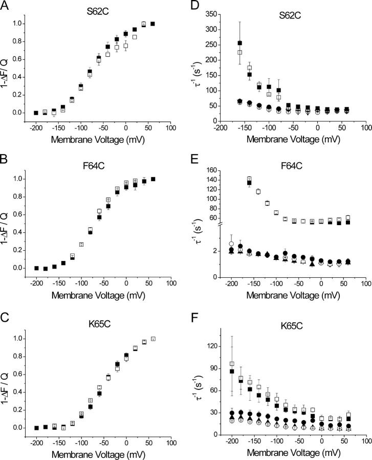 Figure 4. . Voltage dependence and kinetics of voltage jump–induced fluorescence changes and comparison with properties of the corresponding transient charge movements under K+-free (Na+/Na+ exchange) conditions. Data originated from oocytes coexpressing the α subunit construct sNaKα1, ØCys together with sβ1-S62C (A and D), sβ1-F64C (B and E), sβ1-K65C (C and F). Left panels show the voltage dependences of normalized fluorescence saturation values (▪) obtained from mono- (A and C) and biexponential fits (B) to the data, and the corresponding normalized values for the translocated charge (□) obtained from integration of the transient currents recorded in parallel. Curve parameters are summarized in Table I. Right panels show the voltage dependence of reciprocal time constants obtained from monoexponential fits of the transient current traces before (▪) and after (□) labeling of oocytes with TMRM, together with reciprocal time constants from fits of fluorescence signals under K+-free conditions (▴) or in presence of K+ (99.9 mM Na+/0.1 mM K+, ○; 99.5 mM Na+/0.5 mM K+, •). Data are means ± SEM from six oocytes. |