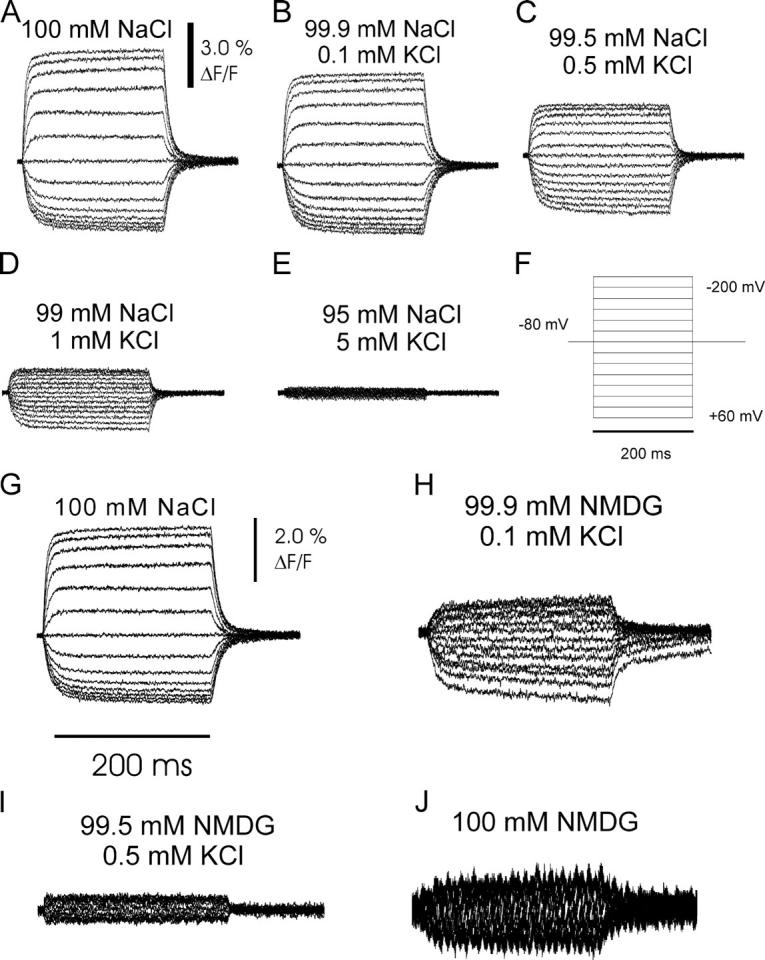 Figure 5. . Voltage pulse–induced fluorescence responses at different extracellular Na+ and K+ concentrations from oocytes coexpressing the α subunit construct sNaKα1, ØCys together with sβ1-S62C. (A–E) K+ titration in presence of Na+. Data were consecutively recorded from a single oocyte after changes to perfusion buffers with the following Na+/K+ contents: (A) 100 mM Na+ (no K+), (B) 99.9 mM Na+ and 0.1 mM K+, (C) 99.5 mM Na+ and 0.5 mM K+, (D) 99 mM Na+ and 1 mM K+, and (E) 95 mM Na+ and 5 mM K+. F shows the applied voltage protocol for all data traces shown in this figure. (G–J) K+ titration in presence of NMDG. Voltage pulse–induced fluorescence responses from a single oocyte experiment at different Na+/NMDG/K+ concentrations: (G) 100 mM Na+ (no K+, for control), (H) 99.9 mM NMDG and 0.1 mM K+, (I) 99.5 mM NMDG and 0.5 mM K+, and (J) 100 mM NMDG. |