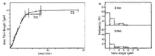 maximum fibril length during the first 4 minutes (DS) or 3 minutes (CS), respectively, is 4.7 mm/min in both cases. (b) Frequency distribution