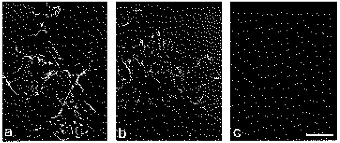 were determined. Dots were not counted as fibrils. For each time point, those three patches with the largest total fibril length, or the highest