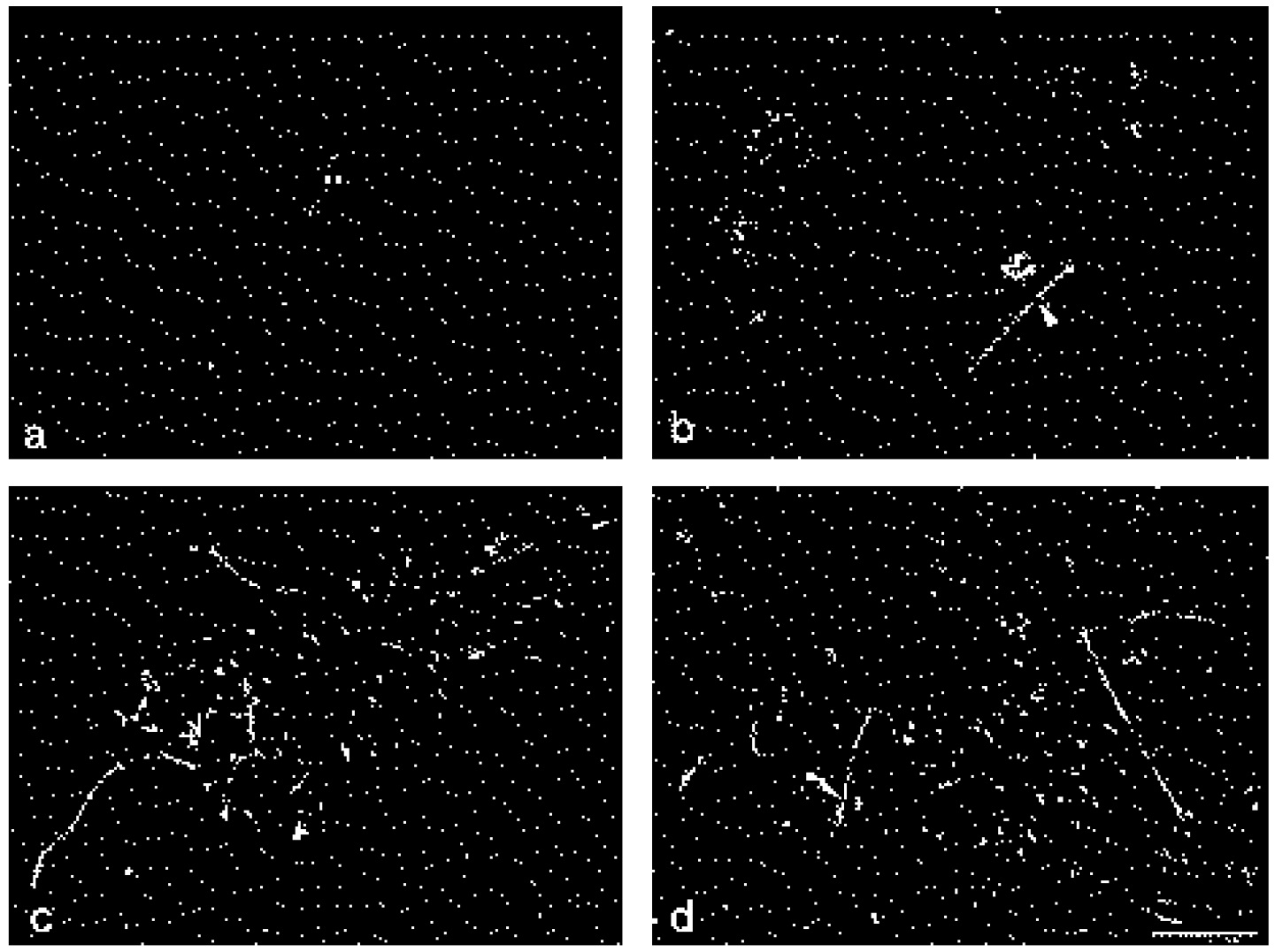 minutes (b), 8 minutes (c) and 18 minutes (d), and stained with FN antibody. Isolated patches of fibrils corresponding in size to single cells