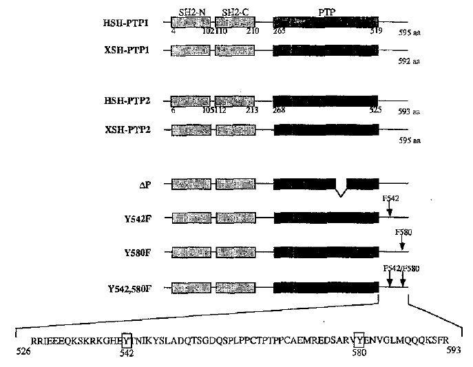 Shown are schematics of human and Xenopus SH-PTP1 and SH-PTP2
