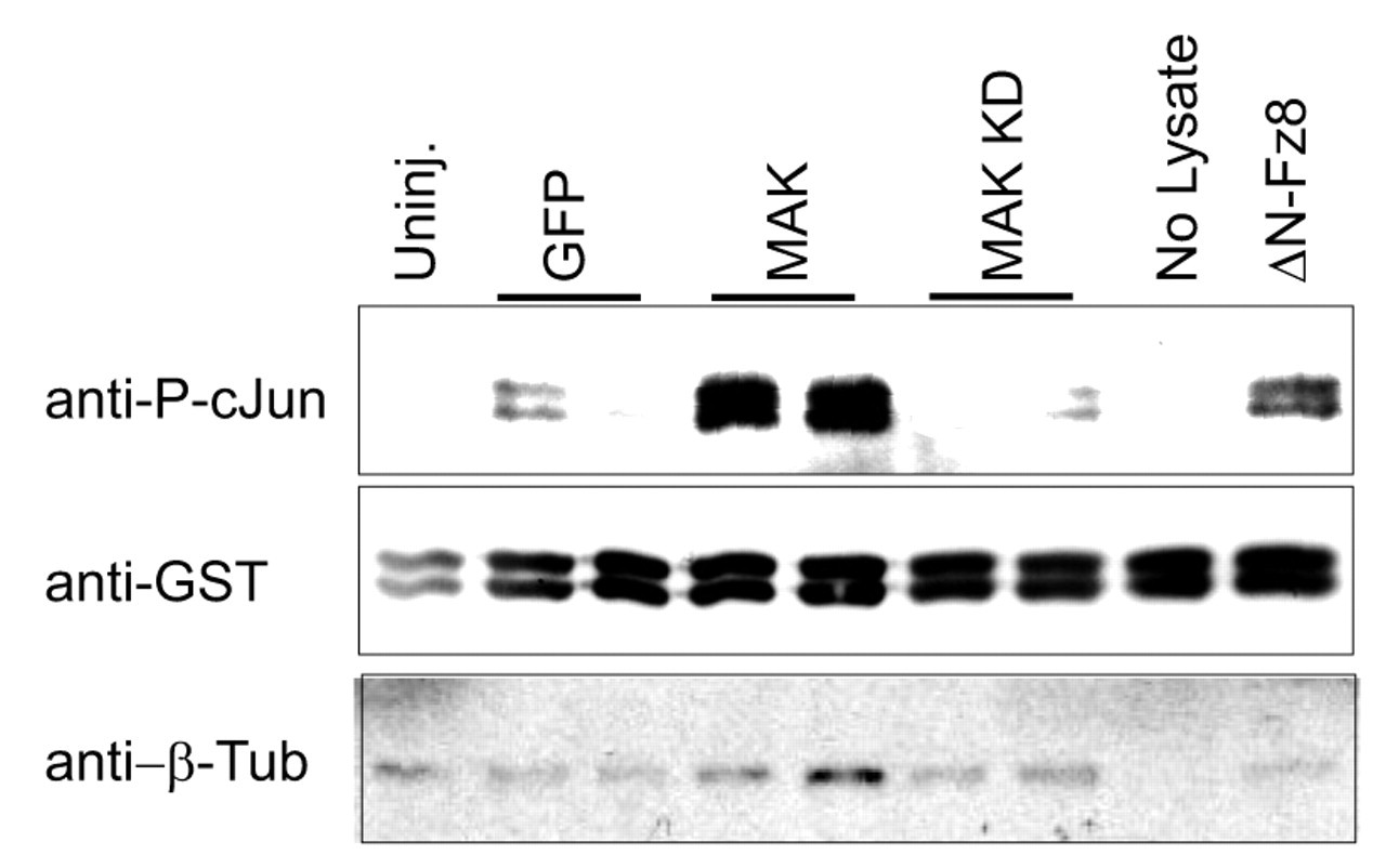 Fig. 3. MAK (hunk) is an activator of JNK. JNK activity was analyzed in embryonic lysates by in vitro phosphorylation of GST-Jun(1-135). Four-cell embryos were injected marginally four times with GFP, MAK or MAK-KD RNA (1.5 ng per injection), or δN-Fz8 RNA (0.5 ng per injection) as a positive control. Lysates were collected at stage 14 for JNK activity determination by western analysis with anti-phospho-Jun antibodies. Assays were carried out in duplicates, with 10 embryos in each experimental group. Anti-GST and anti-β-tubulin antibodies indicate loading. |