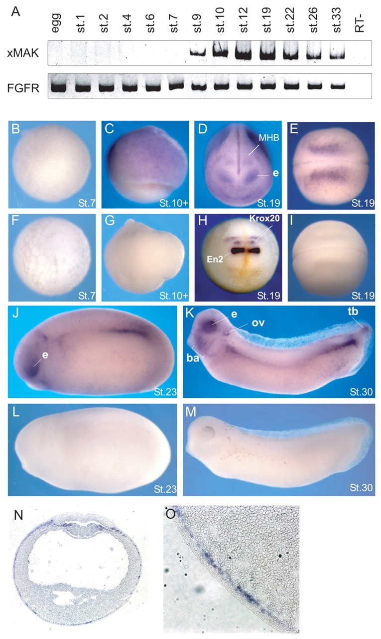 Fig. 1. xMAK expression is dynamically regulated during Xenopus development. (A) The analysis of xMAK expression at different developmental stages. Total RNA from embryos isolated at different developmental stages was used for RT-PCR. FGFR served as a loading control. RT-, no reverse transcriptase. (B-M) Spatial distribution of xMAK RNA revealed by whole-mount in situ hybridization of albino embryos at indicated stages. (B-E,J,K) xMAK antisense probe. (F,G,I,L,M) xMAK sense probe. (D) Anterior view; e, eye; MHB, midbrain-hindbrain boundary. (H) En2 and Krox20 probes, anterior view. En2 is expressed as a bright band at the MHB, located anterior to Krox20, which marks rhombomeres 3 and 5. (B,F) Animal pole view; (C,G) lateral view; (E,I) dorsal view, anterior is towards the left. (J-M) Lateral view, anterior is towards the left. (K) e, eye; ov, otic vesicle; ba, branchial arches; tb, tailbud. (N,O) A cross-section of a stage 17 neurula embryo after in situ hybridization with xMAK antisense probe. Staining is observed in the deep (sensorial) layer of epidermal ectoderm (magnified view shown in O) and in somitogenic mesoderm. |