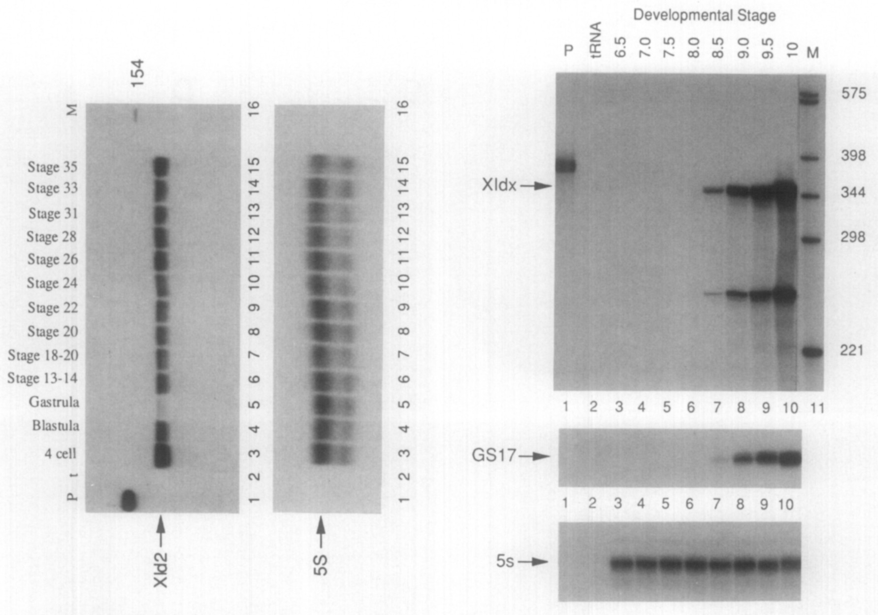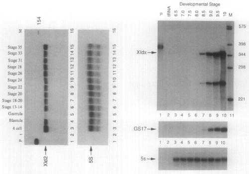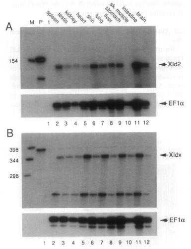 Fig. 5. Distribution of XId2 and XIdx mRNA in adult tissues. Total RNA from adult tissues was analysed by RNAse protection assay for transcripts of the XId2 (panel A) and XIdx (panel B) genes. 10µg of total RNA were used in each hybridisation except lanes 4 and IO which contained 5µg. The level of EFlα mRNA was simultaneously assayed in each sample to provide a loading control. (P): undigested probe; (t): tRNA control; (M) end labelled pBR322 Hinfl size markers.