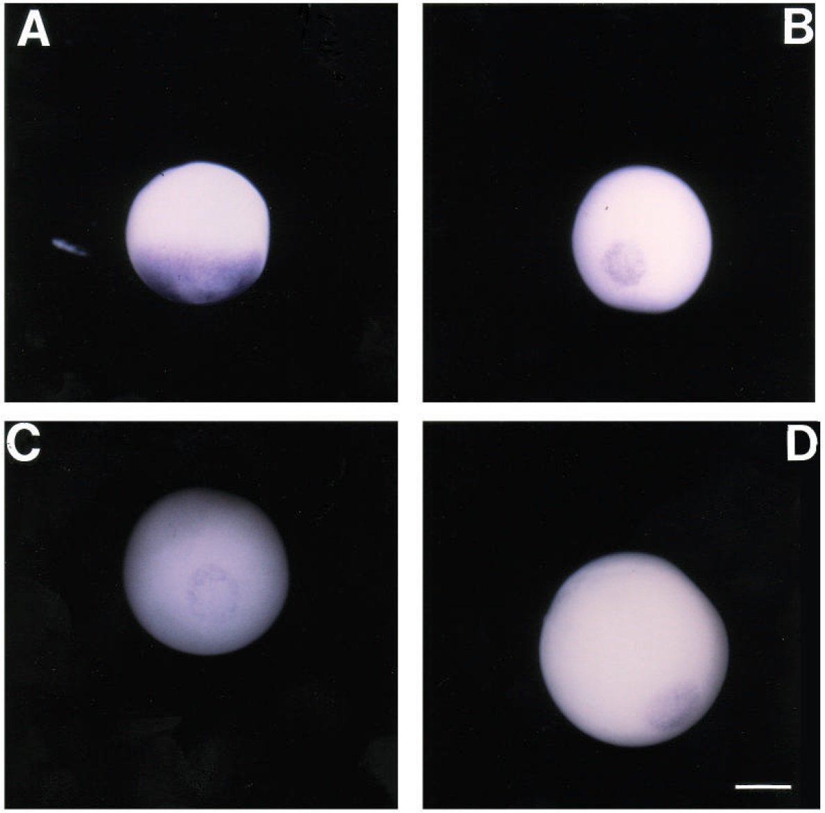 (D) oocyte hybridized with the Xwnt11 probe. The bar in D represents 200 um.