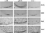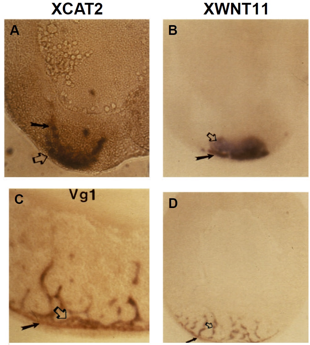 Fig. 4. Detection of Xwnt11, Xcat2, Xlsirts and Vg1 RNAs by double in situ
