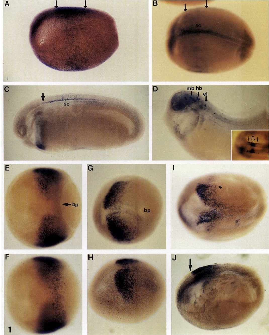 Fig1. Expression patterns of HoxA1 and HoxD1. Expression was examined by whole mount in situ hybridization as described under Materials and Methods. In all cases anterior is left. (A) HoxA1 expression: mid-neurula (Stage 15) lateral view. Black arrows, anterior and posterior boundaries of HoxA1 expression. (B) HoxA1 expression: mid-neurula (stage 17) dorsal view. sc, spinal cord; arrows, anterior and posterior boundaries of expression. (C) HoxA1 expression: tailbud (stage 24), lateral view. sc, spinal cord; arrow, anterior boundary of spinal cord expression. (D) HoxA1 expression: late tailbud (stage 30), lateral view. el, endolymphatic duct; hb, hindbrain; mb, midbrain. (Inset) HoxA1 expression relative to en-2. Closed arrows, HoxA1 expression; open arrow, en-2 expression. (E) HoxD1 expression: mid gastrula (stage 11) dorsal view. bp, blastopore; arrow dorsal lip. (F) HoxD1 expression: mid gastrula (stage 11), ventral view. (G) HoxD1 expression: early neurula (stage 13), dorsal view. (H) HOXD1 early neurula (stage 13), lateral view.(I) HoxD1 expression: mid neurula (stage 16), dorsal view. (J) HoxD1 expression: mid neural (stage 16), lateral view. Arrow, anterior boundary of expression.