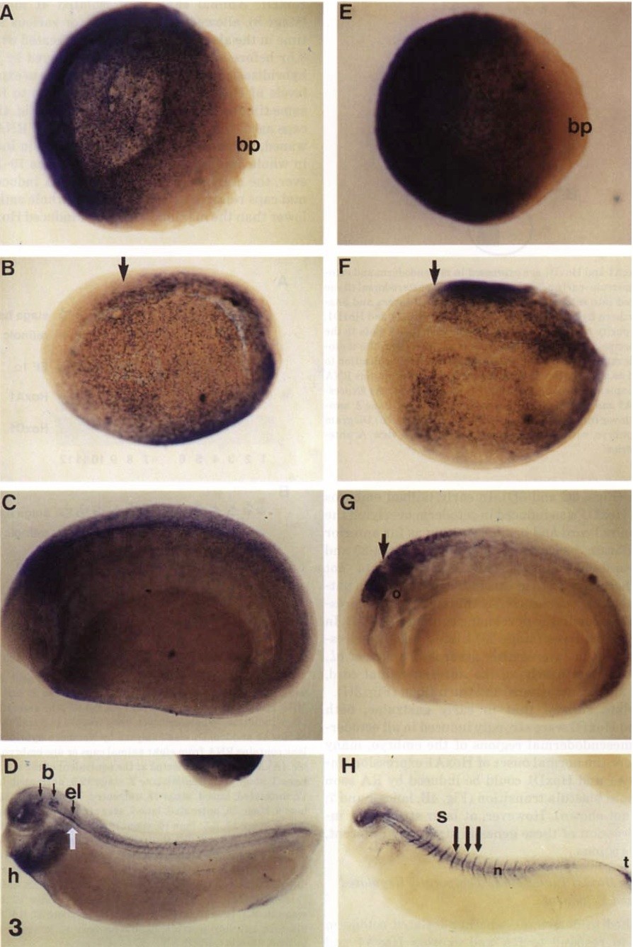 Fig3. Expression patterns of HoxA1 and HoxD1 are altered by retinoic acid. The expression of HoxA1 and HoxD1 was analayzed by whole mount in situ hydridization as described under Materials and Methods. Embryos were treated continuously with 1um all trans retinoic acid from mid-bastula onward unless otherwise indicated. (A) HoxA1 expression: mid gastrula (stage 11) bp= blastopore. (B) HoxA1 expression neurula (stage 14), lateral view. Arrow= anterior boundary. (C) HoxA1 expression: tailbudembryo (stage 22) treated with 1uM RA for 3hr prior to collection. (D) HoxA1 expression: (stage 29) treated with 1uM RA for 3hr prior to collection. (E) HoxD1 expression: midgastrula (stage 11) bp. blastopore. (F) HoxD1 expression: early neurula (stage 13) dorsolateral view. Arrow, gap in expression. O = Otic vesicle. (H) HoxD1 expression: late tailbudembryo (stage 29-30) treated with RA for 3hr prior to collection. Arrows, intersomitic fissures; n= notochord; t=tailbud; s=anterior spinal cord.
