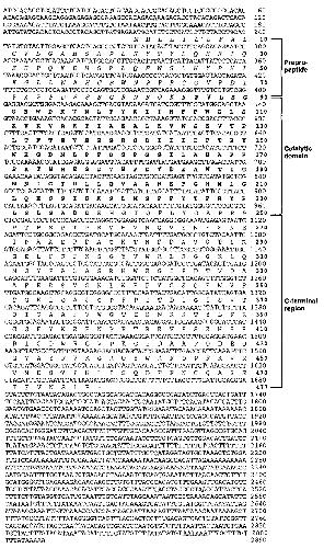 enzyme(BassetetaL,l990) are shown. The propeptide region contains a highly conserved sequence PRCGVPD (underlined) that is charaeteristic