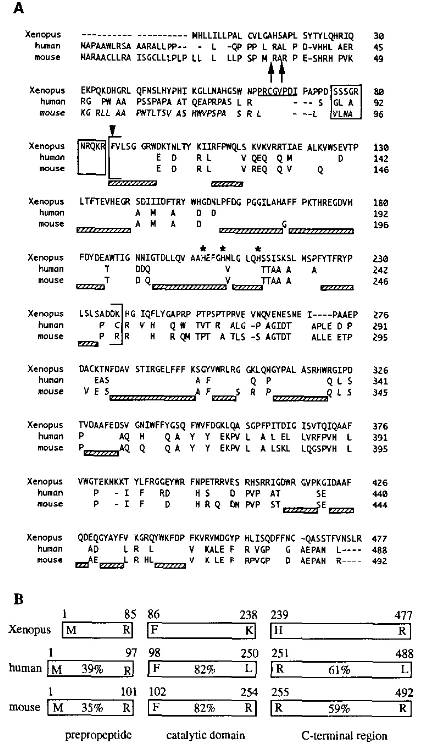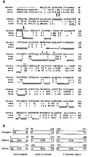 the frog and mammalian proteins, while I he pre- and propeptides are more dissimilar; numbers indicate the percentage identity between aligned