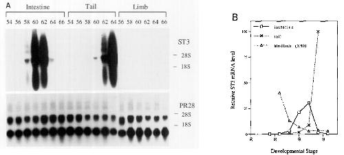 hindlimb at stage 56; levels of ST3 mRNA were normalized to that of tbe PR28 control; to facilitate the graphing of low levels of ST$ mRNA
