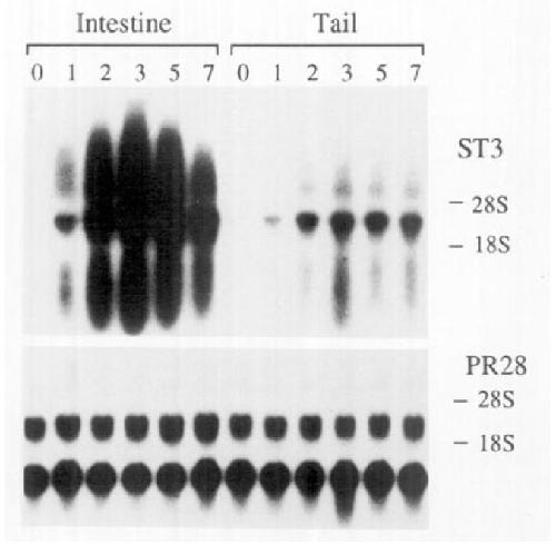 Fro. 4. High levels of ST9 gene expression were found during metamorphosis in the remodeling intestine and resorbing tall, but not in the