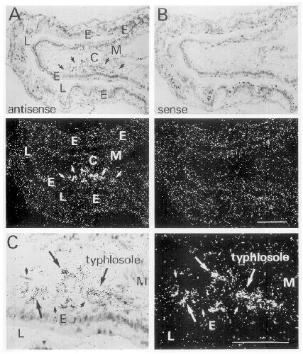dark-field photomicrographs of cross sections from the small intestines hybridized with an antisense S1'3 probe (A) but not with a sense probe