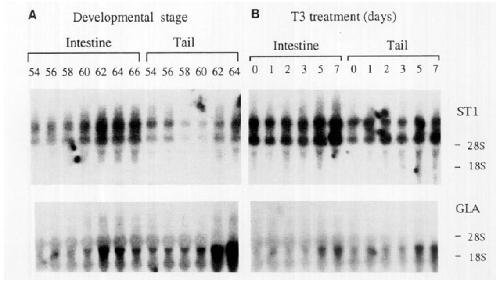 (GLA) genes that are different from frog STS: frog STI-Iike mRNA was expressed throughout development.. whereas in both tail and intestine,