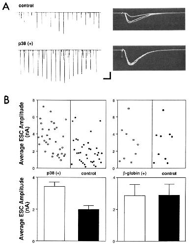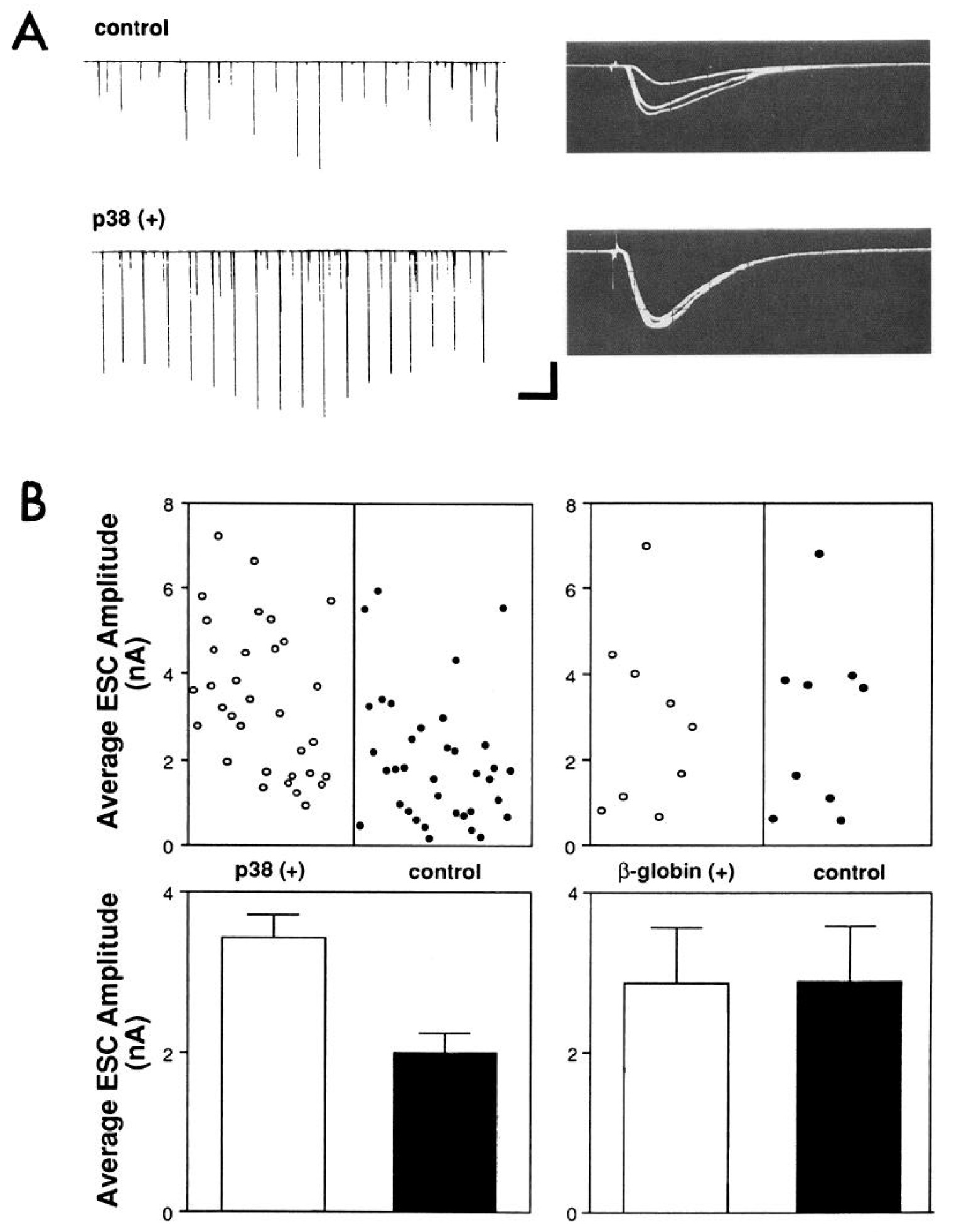 respectivelyB. , Evokedr esponsefos r p38(+) synapseasn d control synapse(sle ft) and fi-globin and control synapse(srig ht). Eachd ata point