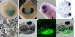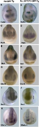 The TOP:dGFP transgene (A) is expressed in the developing eye (arrowhead) at stage 20 (B), and stage 23 (C), as revealed by in situ hybridization. The midbrain/hindbrain boundary is marked by En expression (arrow in [B]) or reporter expression (arrow in [C]). (D) Rx promoter driving ÎN-Tcf3 tagged with GFP (Rx:ÎN-Tcf3-GFP). (E) GFP antibody staining reveals transgene expression in the developing eye (stage 23). (F) Disrupted eye development in transgenic embryos (stage 41). (G) Sections through the same embryo reveal loss of neural retina tissue, but remnants of RPE and lens (L). Section is stained with the nuclear dye Hoechst (blue). |
