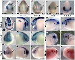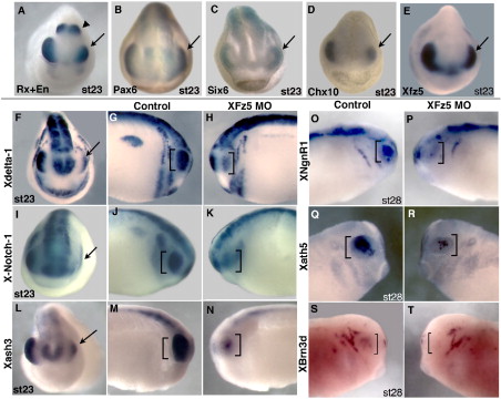 The Xfz5 MO results in a smaller expression domain for Rx (A), Pax6 (B), Six6 (C), Chx10 (D), and Xfz5 (E), but the relative levels of expression are unchanged compared to the control side. En expression (arrowhead in [A]) is unchanged. Expression of Xdelta-1 (FâH), X-Notch-1 (IâK), Xash3 (LâN), XNgnR-1 (O and P), Xath5 (Q and R), and XBrn3d (S and T) are suppressed on the Xfz5 MO-injected side. Arrow indicates injected side. |