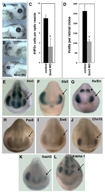 (A and B) Reduced eye size with Sox2 MO injection at the 8-cell stage. (C) Sox2 MO injection causes reduction in anti-phosphohistone H3 (HP3) staining within the optic vesicle at stage 23/24. Uninjected side is the control. n = 8 embryos. (D) Retinal clone size is reduced by the Sox2 MO. GFP RNA was coinjected, and the number of GFP-labeled cells was counted in six central retinal sections for each embryo (n = 9 embryos). In (C) and (D), error bars represent SEM; *p < 0.001 by Studentâs t test. Sox2 MO does not affect the intensity of Sox2 (E), Xfz5 (F), Rx (G), Pax6 (H), Six6 (I), and Chx10 (J) expression within the optic vesicle. En expression (arrowhead in [G]) is unchanged. The Sox2 MO suppresses the retinal expression of Xash3 (K) and Xdelta-1 (L). Injected side is on the right (arrow).