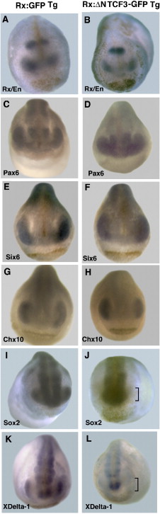 Rx:ΔN-Tcf3-GFP transgenic embryos (stage 23) show normal expression of Rx and En (B) and the retinal progenitor markers Pax6 (D), Six6 (F), and Chx10 (H) compared to control Rx:GFP transgenic embryos (A, C, E, and G). Rx:ΔN-Tcf3-GFP transgenic embryos show loss of both Sox2 and Xdelta-1 expression in the retinal domain (bracket in [J] and [L]) as compared to control transgenic embryos (Rx:GFP) (I and K). |