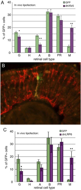 (A) Expression of dnXfz5 in retinal progenitors by in vivo lipofection caused a 4-fold increase in the representation of Mu¨ller glia as compared to GFP controls. n = 1706 cells from 26 embryos for GFP, n = 402 cells from 9 embryos for dnXfz5. (B) Retinal section (stage 41) showing a GFP-labeled cell (green) expressing dnXfz5 that is colabeled using antibodies for the Mu¨ller glial cell marker CRALBP (red). (C) Expression of dnLRP6 in retinal progenitors by in vivo lipofection also caused a significant increase in the representation of Mu¨ller glia as compared to GFP controls. n = 391 cells from 6 embryos for GFP, n = 252 cells from 5 embryos for dnLRP6. For (A) and (C), the percent representation of each cell type was calculated as a weighted average, and error bars represent SEM; **p < 0.001, *p < 0.05 by Student’s t test. G, ganglion cells; H, horizontal cells; A, amacrine cells; B, bipolar cells; PR, photoreceptor cells; M, Mu¨ller glial cells.