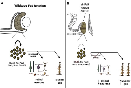 (A) During normal development, Xfz5 regulates the expression of Sox2 in retinal progenitors, allowing progenitors to proliferate, express proneural genes, and ultimately differentiate into postmitotic retinal neurons. (B) When Xfz5 function is blocked, Sox2 expression is reduced in retinal progenitors, resulting in reduced proliferation, loss of proneural gene expression, and a bias toward the nonneural Mu¨ller glial fate. |