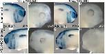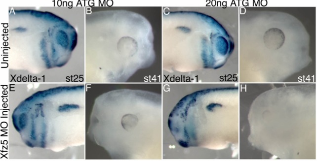 When 10 ng of Xfz5 MO is used, Xdelta-1 expression recovers by stage 25 (E) with expression levels similar to control (A). This dose results in a smaller eye at stage 41 (F). However, when 20 ng of Xfz5 MO is used, Xdelta-1 expression is still absent at stage 25 (G) and results in a near complete loss of the eye at stage 41 (H). (AâD) uninjected control; (EâH) Xfz5 MO-injected side. |