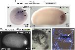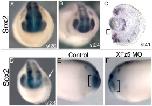Sox2 expression in (A) the emerging optic vesicles (stage 20) and (B) the developing eye (stage 24). (C) In retinal sections (stage 41), Sox2 expression is restricted to the CMZ, but excluded from the peripheral region (bracket). (DâF) Sox2 expression is suppressed on the Xfz5 MO-injected side (arrow in [D] and [F]) compared to the uninjected control side (E). (D) Frontal view. (E and F) Lateral views. |