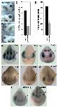 Xfz5 is expressed in the early optic vesicle starting at stage 17 (A) and continues to be strongly expressed in the eye at stage 21 (B) and stage 31 (C). Retinal sections at stage 41 (D) show Xfz5 is expressed within the CMZ but not in the peripheral region (brackets). (EâI) Reduced eye size following Xfz5 MO (Xfz5 ATG) injection at the 8-cell stage. (E) Uninjected side. (F) Xfz5 MO-injected side. Embryo marked with an asterisk is shown in dorsal views in (G)â(I). (G) Brightfield view. (H) eGFP expression marks injected side. (I) merge of (G) and (H). |