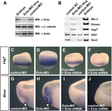 Figure 2. Depletion of Ectodermin Causes a Shift in Cellular Fates along the Animal-Vegetal Axis (A) Ecto morpholino oligonucleotides specifically knockdown the translation of endogenous Ectodermin protein in whole embryos (control-MO and Ecto-MO, 60 ng/embryo). (B) Animal caps were injected with 60 ng of control-MO or Ecto-MO, explanted at the late blastula stage (stage 9.5), and analyzed by RT-PCR. Note the induction of mesoderm markers in Ecto-depleted cells. (C–J) Molecular characterization of Ecto knockdown by in situ hybridization on whole embryos (midgastrula stage). (C and D) Zygotic VegT, a mesoderm-specific marker, spreads toward the animal pole. (G and H) Mixer expression at the boundary between endoderm and mesoderm (dashed line) is expanded. Arrowheads point to the dorsal lip. A morpholino-insensitive Ecto mRNA (1.5 ng) is biologically active (F and J) and reverses the knockdown phenotypes (E and I). Targeted injection of Ecto-MO in marginal explants confirms ectopic expression of Mixer and Mix.2 in the mesoderm (see Figure S2B). |