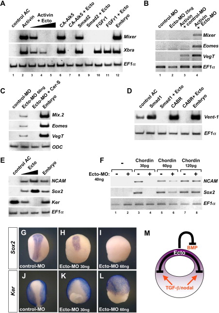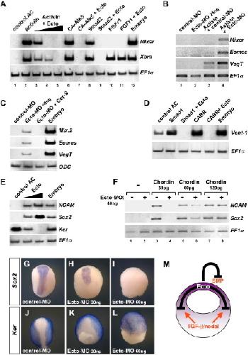Figure 3. Ectodermin Prevents TGF-β and BMP Signaling (A) RT-PCR analysis of animal caps expressing the indicated mRNAs (dose in parenthesis). Lanes 2–5: the inductions by Activin (40 pg) are downregulated by increasing doses of Ecto (lane 3, 200 pg; lane 4, 400 pg; lane 5, 800 pg). Lanes 6–11: Ecto (500 pg) blocks inductions by CA-Alk5 (200 pg) and Smad2 (300 pg) but not by FGFr1 (1 ng). (B) RT-PCR analysis of injected animal caps shows that a low dose of Ecto-MO (25 ng), which is inactive by itself, can induce mesoderm very effectively in conjunction with suboptimal doses of Activin protein (compare lane 4 with lanes 2 and 3). (C) Ectopic mesoderm gene expressions triggered by Ecto-MO (60 ng) are blocked by coinjection of the TGF-β antagonist Cer-S mRNA (300 pg). (D) Activation of the BMP target Vent-1 by Smad1 mRNA (1 ng) and CABR mRNA (700 pg) is antagonized by Ecto mRNA (800 pg). (E) Forced expression of Ecto mRNA (400 pg and 800 pg) in cultured animal caps (harvested at stage 27) leads to upregulation of neural markers (NCAM and Sox2) and downregulation of epidermis (Ker). (F) Ecto-depleted animal cap cells display a reduced responsiveness to neural induction triggered by increasing amounts of Chordin mRNA. Ecto-depleted animal cap cells are resistant to weak BMP antagonism (lanes 3 and 4) but still undergo neural default differentiation upon complete BMP blockade (lanes 7 and 8). To prevent any interference with the mesoderm-inducing effects of Ecto-MO (+), animal caps were explanted at the early blastula stage (stage 8–8.5), when they have not yet received any mesoderm-inducing signal. (−) stands for Control-MO. (G–L) Downregulation of Ectodermin by doses of Ecto-MO parallels with reduction of neural tissue (Sox2) and concomitant expansion of epidermis (ker). (M) A model for the function of Ectodermin during embryogenesis. |