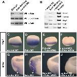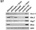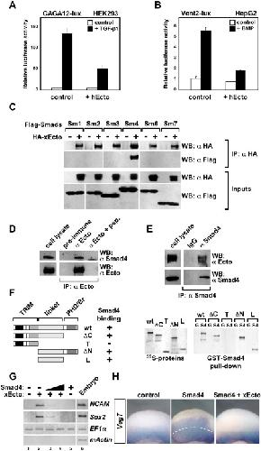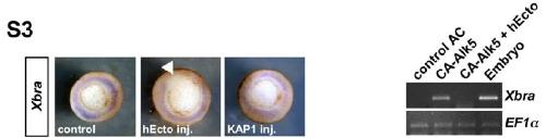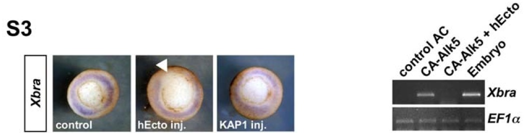 Supplemental Figure S3 Injection of human Ecto mRNA (2 ng) inhibits TGF-beta signaling in Xenopus assays. Left, in situ hybridization of gastrulae developed from embryos injected at the 8-cell stage in a single vegetal blastomere, showing Xbra reduction (arrowhead). Note that injection of the same dose of the related KAP1 mRNA has no effect. Right, RT-PCR on animal caps expressing the indicated mRNAs. hEctodermin blocks ectopic TGF-β signaling. |