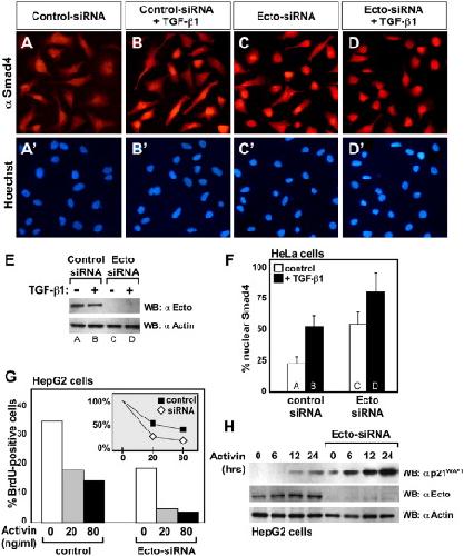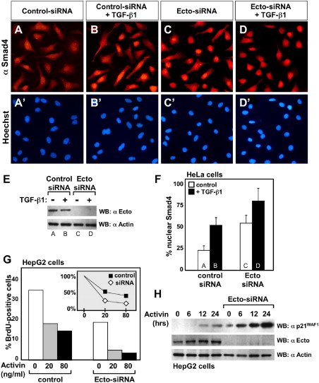 Figure 6. Ectodermin Limits Smad4 Nuclear Accumulation and TGF-β-Induced Growth Arrest (A–D) Immunofluorescence localization of endogenous Smad4 in control-siRNA- and Ecto-siRNA-depleted HeLa cells, untreated or treated for 90 min with 5 ng/ml TGF-β1 (see Experimental Procedures). Nuclei of the same cells were stained with Hoechst (A′–D′). (E) Western blotting for samples shown in (A)–(D) to demonstrate quantitative depletion of endogenous Ecto by RNAi. (F) Quantitations of HeLa cells displaying nuclear Smad4 (same as pictures shown in [A]–[D]). (A) 18%, n = 266; (B) 46%, n = 536; (C) 49%, n = 305; (D) 79%, n = 965. Error bars are standard deviations. (G) Growth-inhibitory effect of Activin on mock and Ecto-siRNA-treated HepG2 cells, as measured by BrdU incorporation. Columns show the percentage of cells in active DNA synthesis. Inset: the number of BrdU-positive cells in unstimulated cultures was given an arbitrary value of 100%; all other values (Activin treatments) are shown relative to this. Activin is more effective upon Ecto knockdown. (H) Time course of p21WAF1 induction by Activin (20 ng/ml) in mock and Ecto-depleted HepG2 cells. t = 0 is 48 hr after transfection of siRNA. Note that induction of p21WAF1 has an earlier onset and reaches higher levels upon Ecto knockdown. |